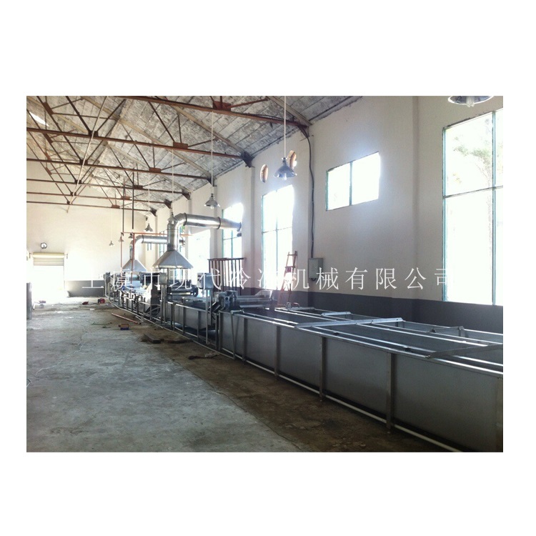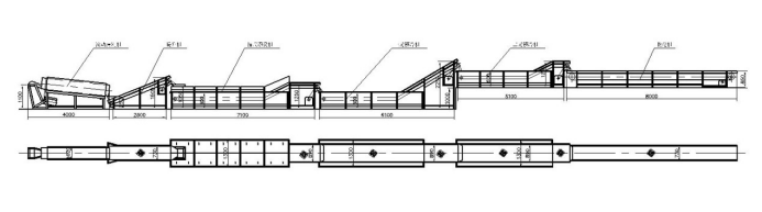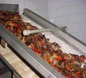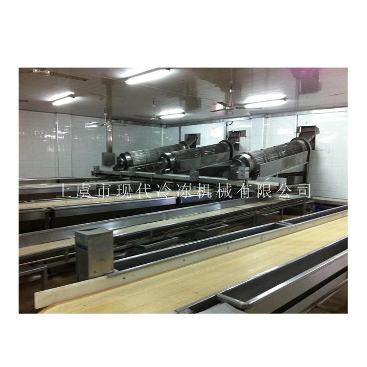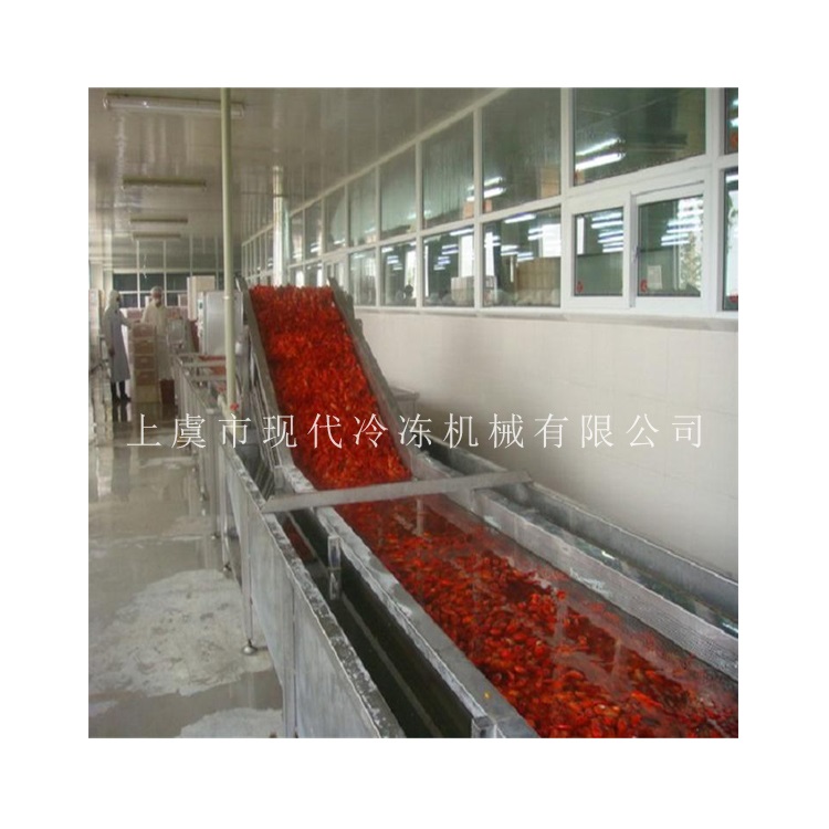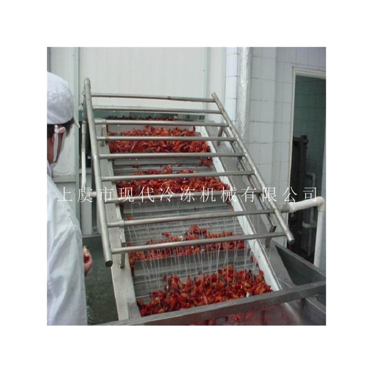 本套前處理生產(chǎn)線共分為六個(gè)部分:提升機(jī)+滾動(dòng)分級(jí)機(jī)+箱式漂燙機(jī) +常溫水預(yù)冷機(jī)+冰水預(yù)冷機(jī)+隧道速凍設(shè)備/液氮速凍設(shè)備;可以速凍整蝦